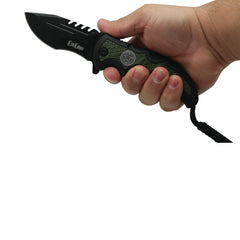 The Military Medallion 8.5" Rescue Knife is a solid knife with great heft. The rugged stainless steel blade will handle almost any task you throw at it. Opens super quick with just your finger. Measures 5" closed, 8.5" open. Non-slip rubber insert on the handle and a steel belt clip to keep it handy. Paracord attachment for emergencies. Military medallion inset.